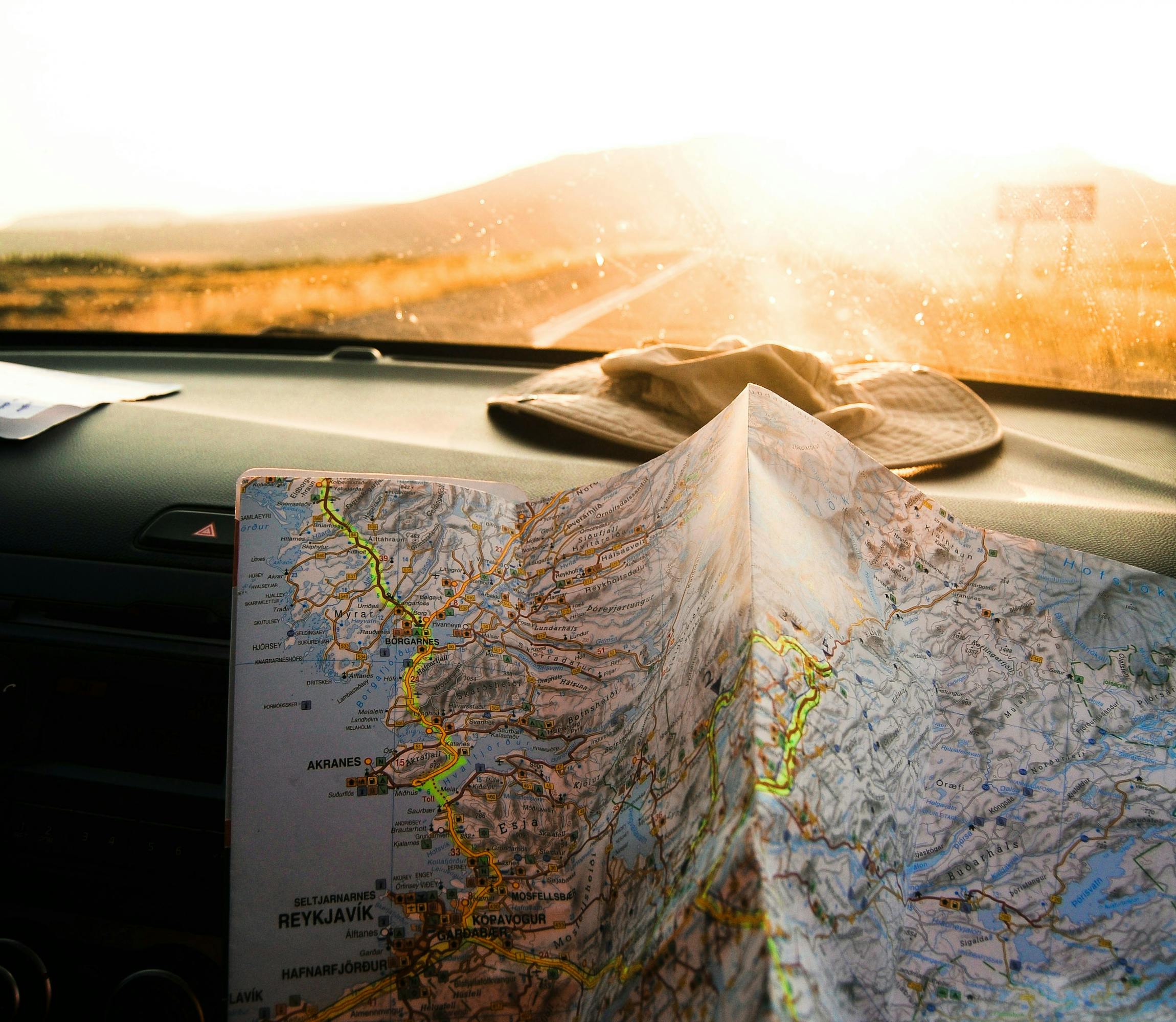 person checking map in car while on a dirt road
